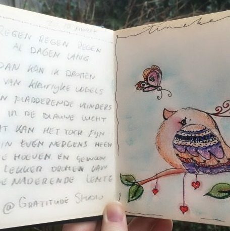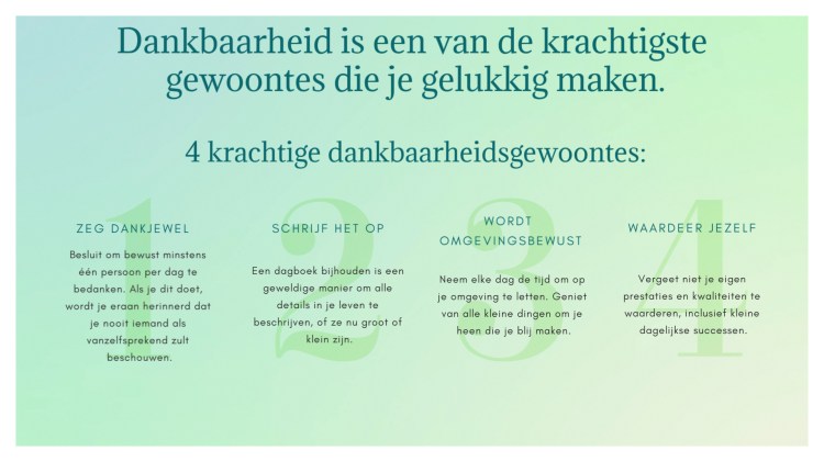 Je kunt eenvoudig voor jezelf een notitieboekje aanschaffen om dagelijks drie mooie ervaringen van dankbaarheid op te schrijven. Of leg het vast in je telefoon, via een app. Er zijn tal van mogelijkheden te bedenken om dankbaarheid als een goede krachtige gewoonte te maken. Op een creatieve manier kun je dankbaarheid zichtbaar maken, bijvoorbeeld in de vorm van een dagboekje (zie als voorbeeld de uitgelichte afbeelding).