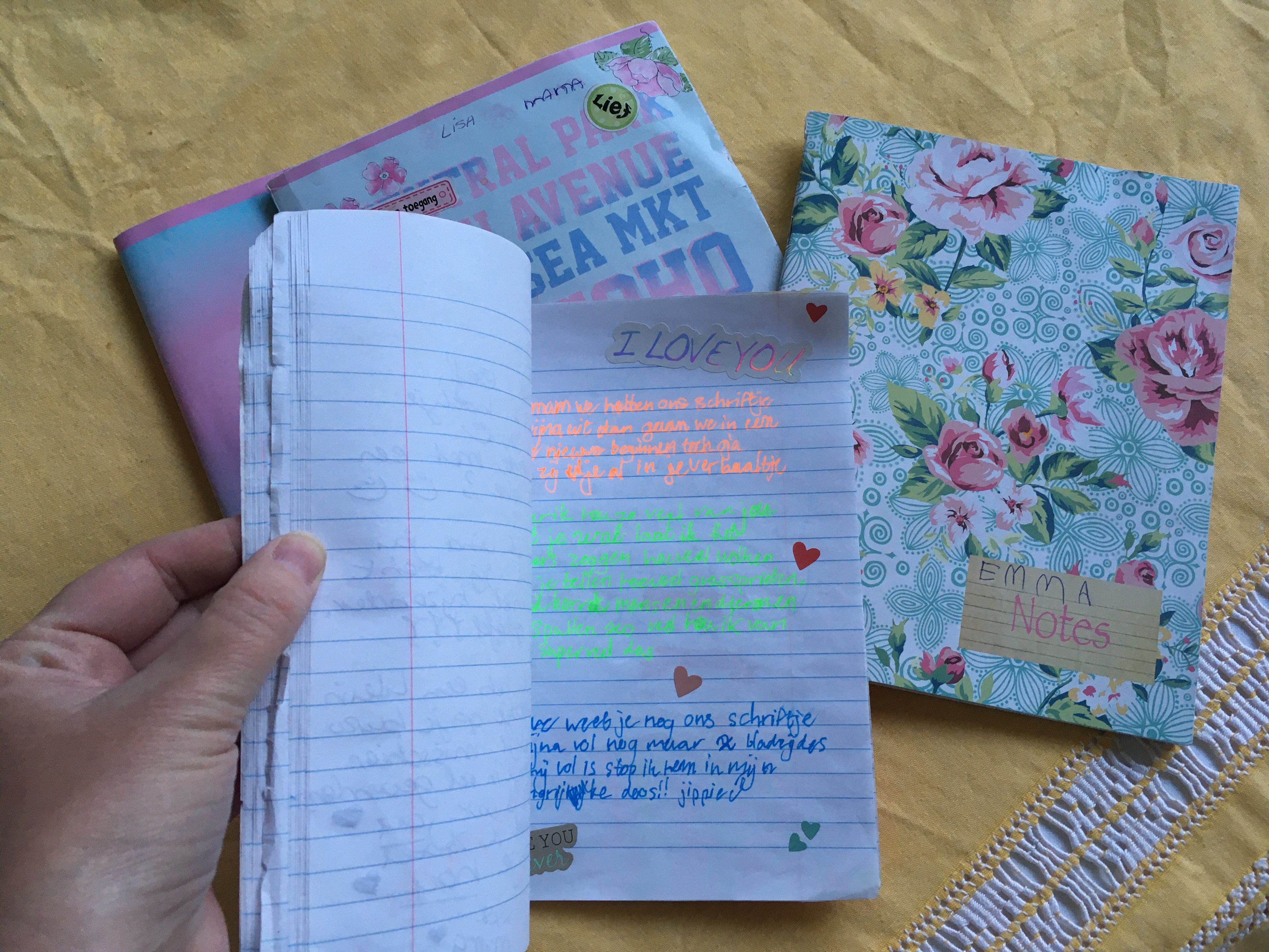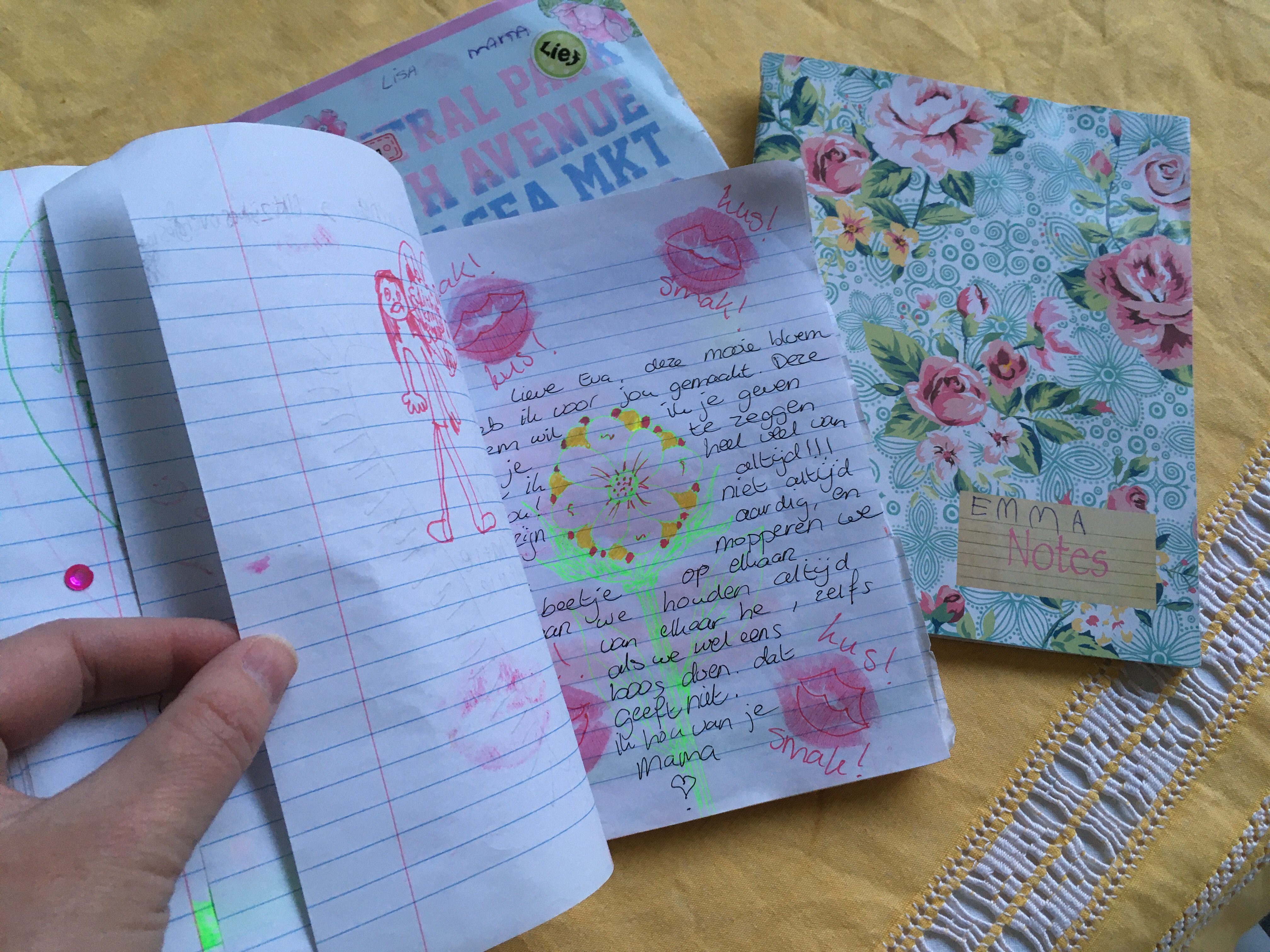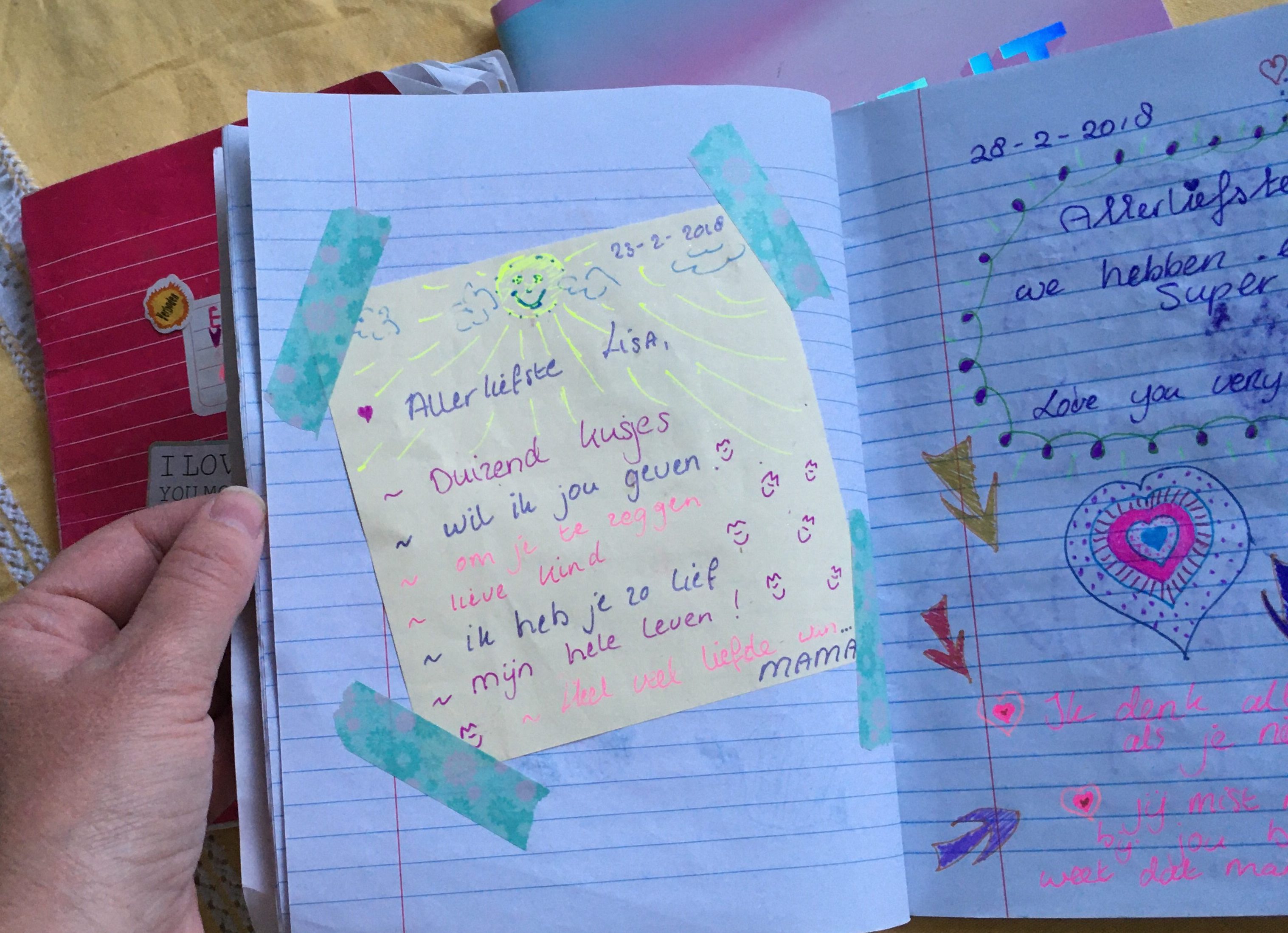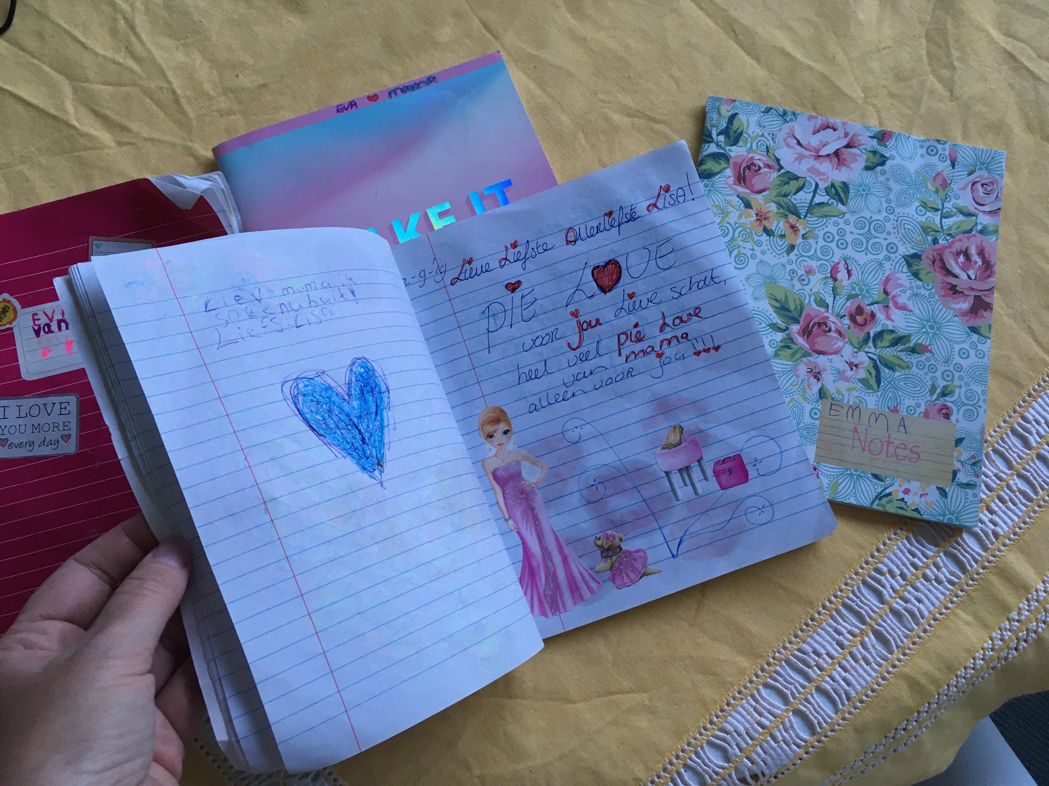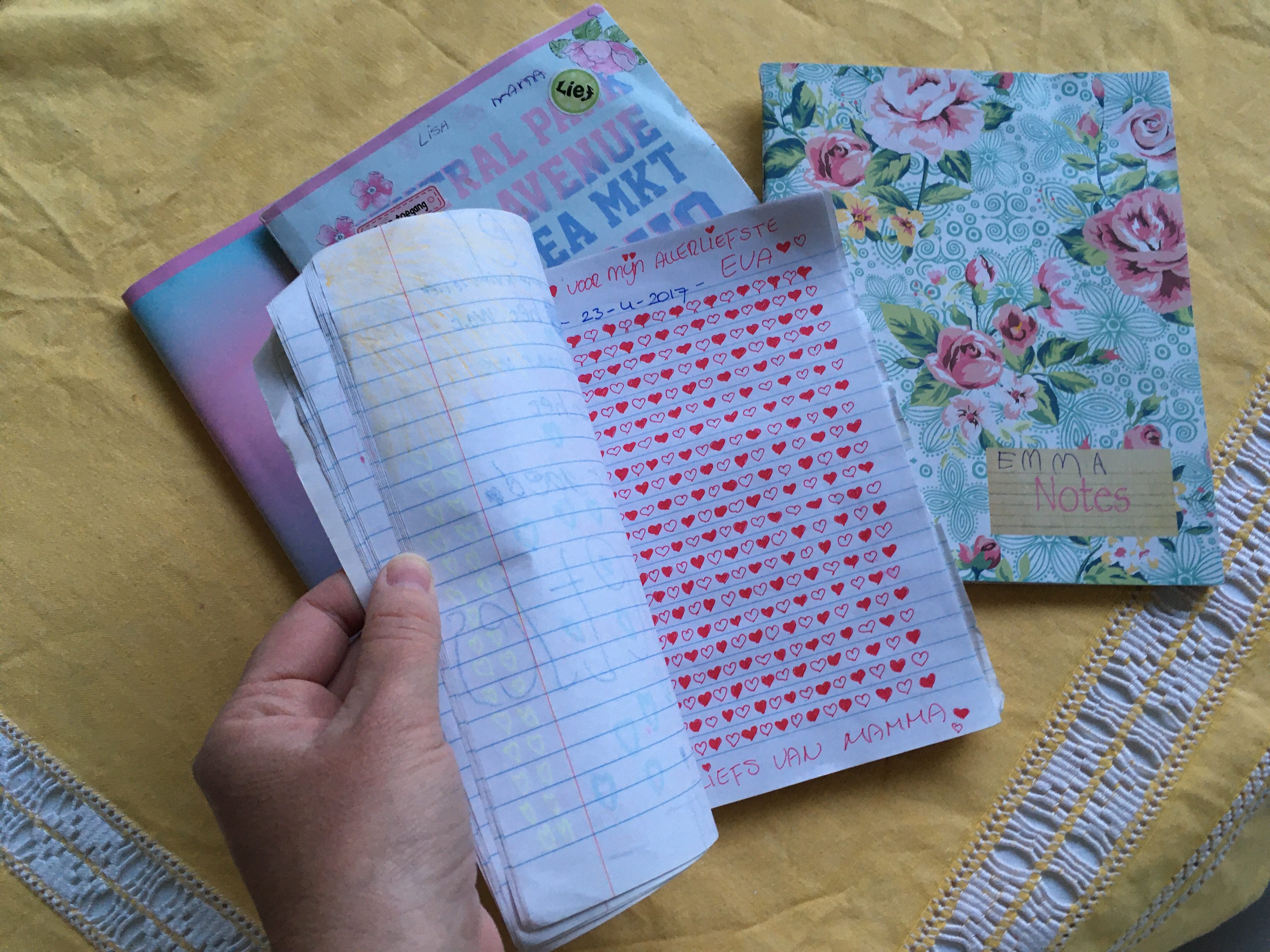 Ik ben begonnen met dagboekschrijven met mijn drie dochters tijdens een hectische en lastige periode waarin communiceren niet altijd even makkelijk was. Mijn jongste was toen 5 jaar, mijn middelste 7 en mijn oudste 9. Inmiddels zijn we een paar jaar en twee à drie schriften verder. We hebben alle vier een eigen boekje die we uitwisselen, waarin we korte berichten schrijven en kleine tekeningetjes maken. Wanneer we klaar zijn, leggen we het schriftje op een plek waar de ander gegarandeerd komt, bijvoorbeeld op het kussen van het bed of op het nachtkastje.