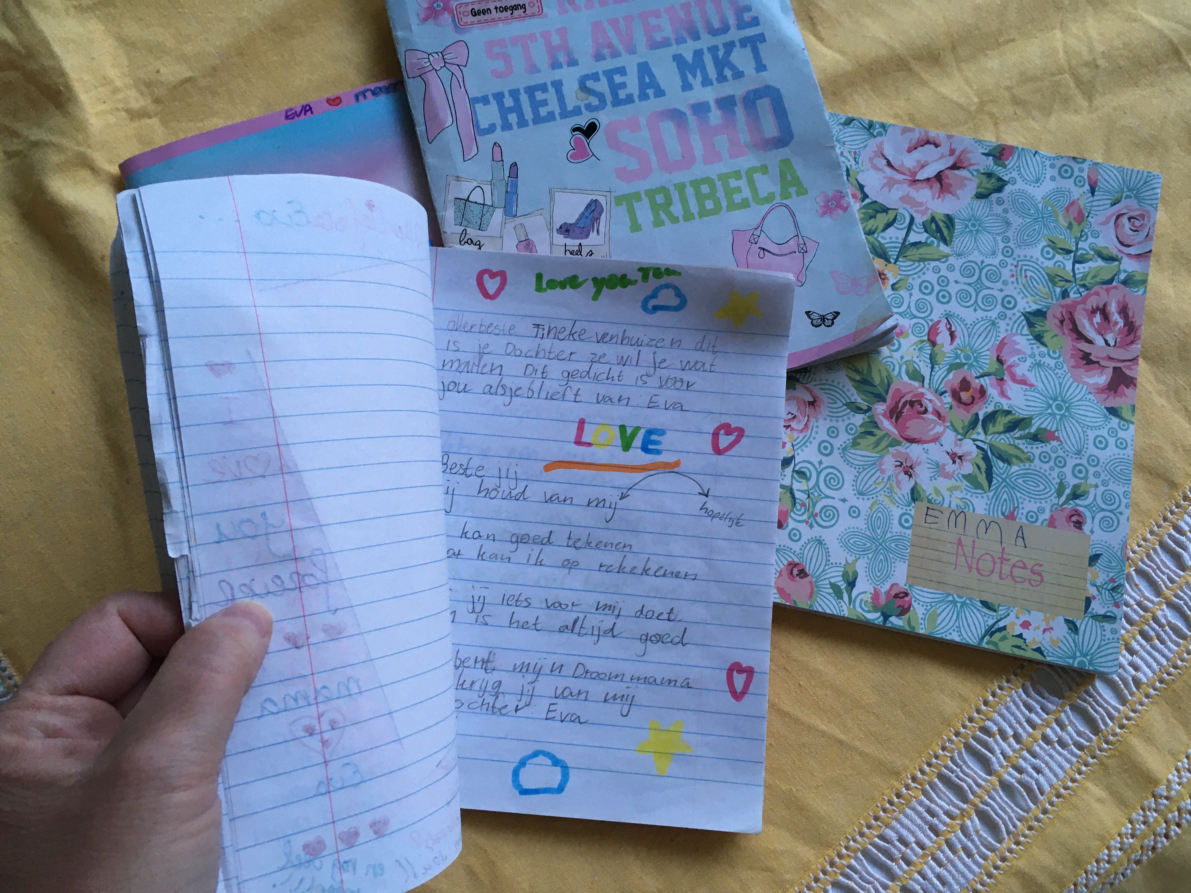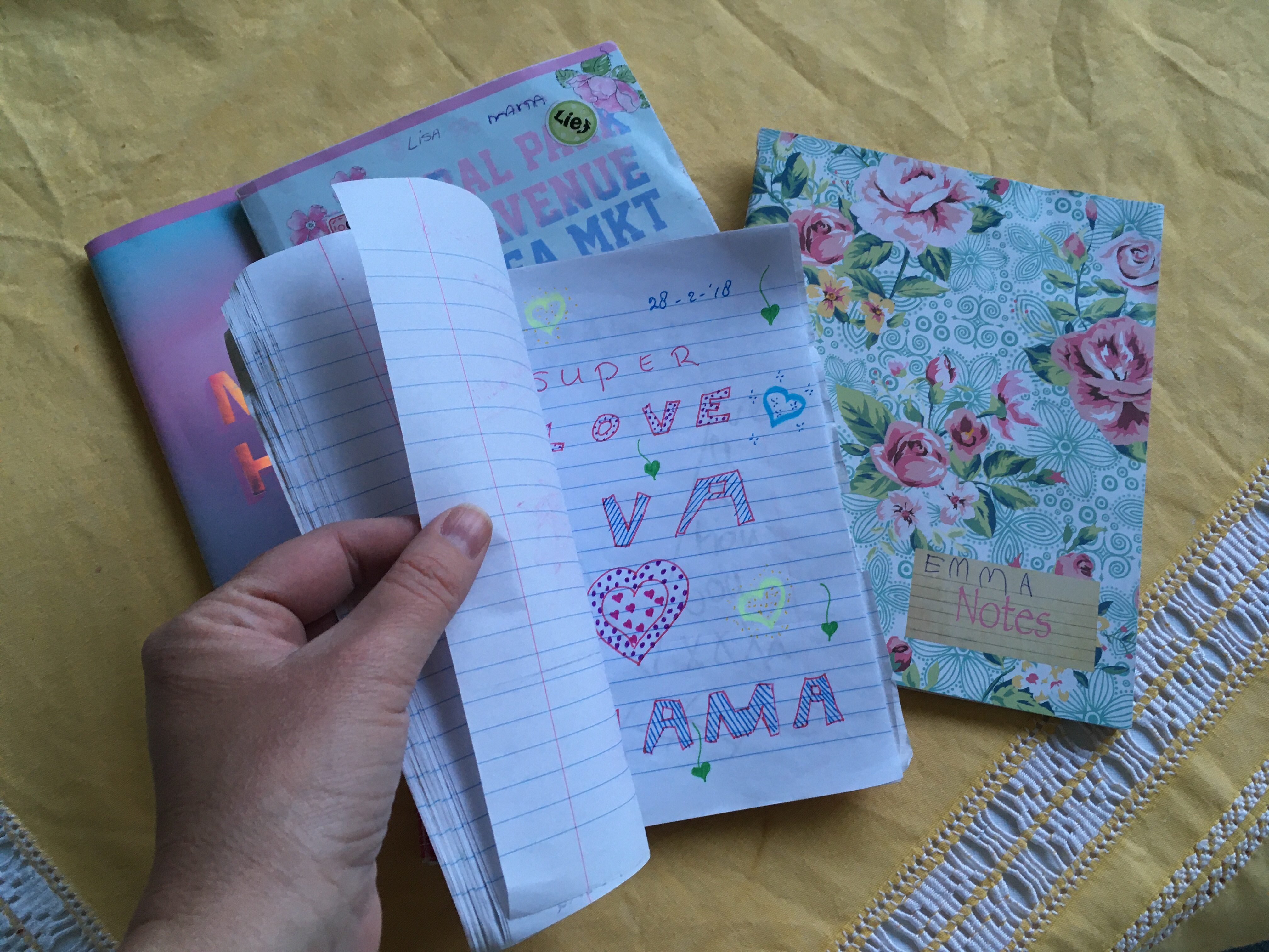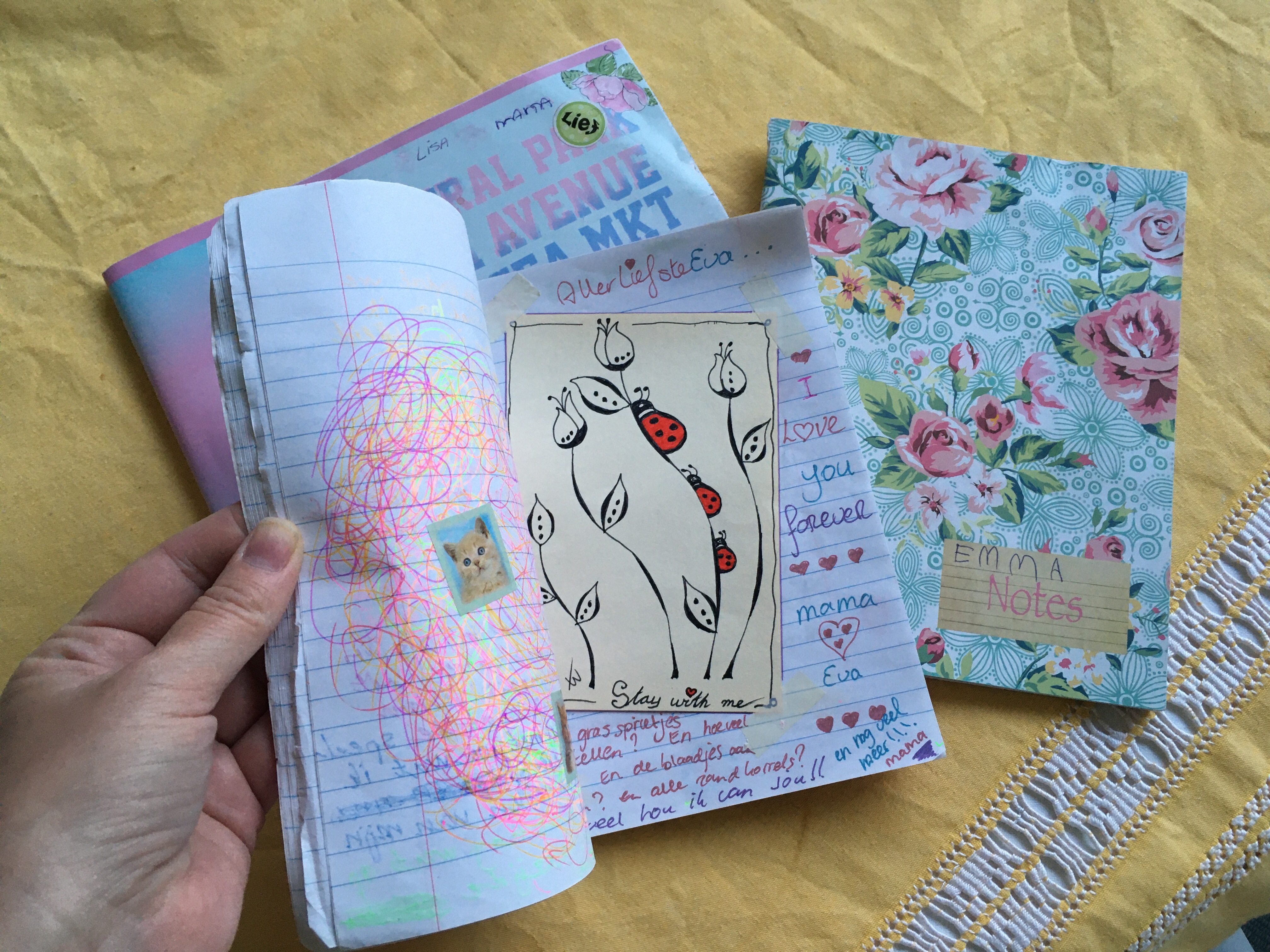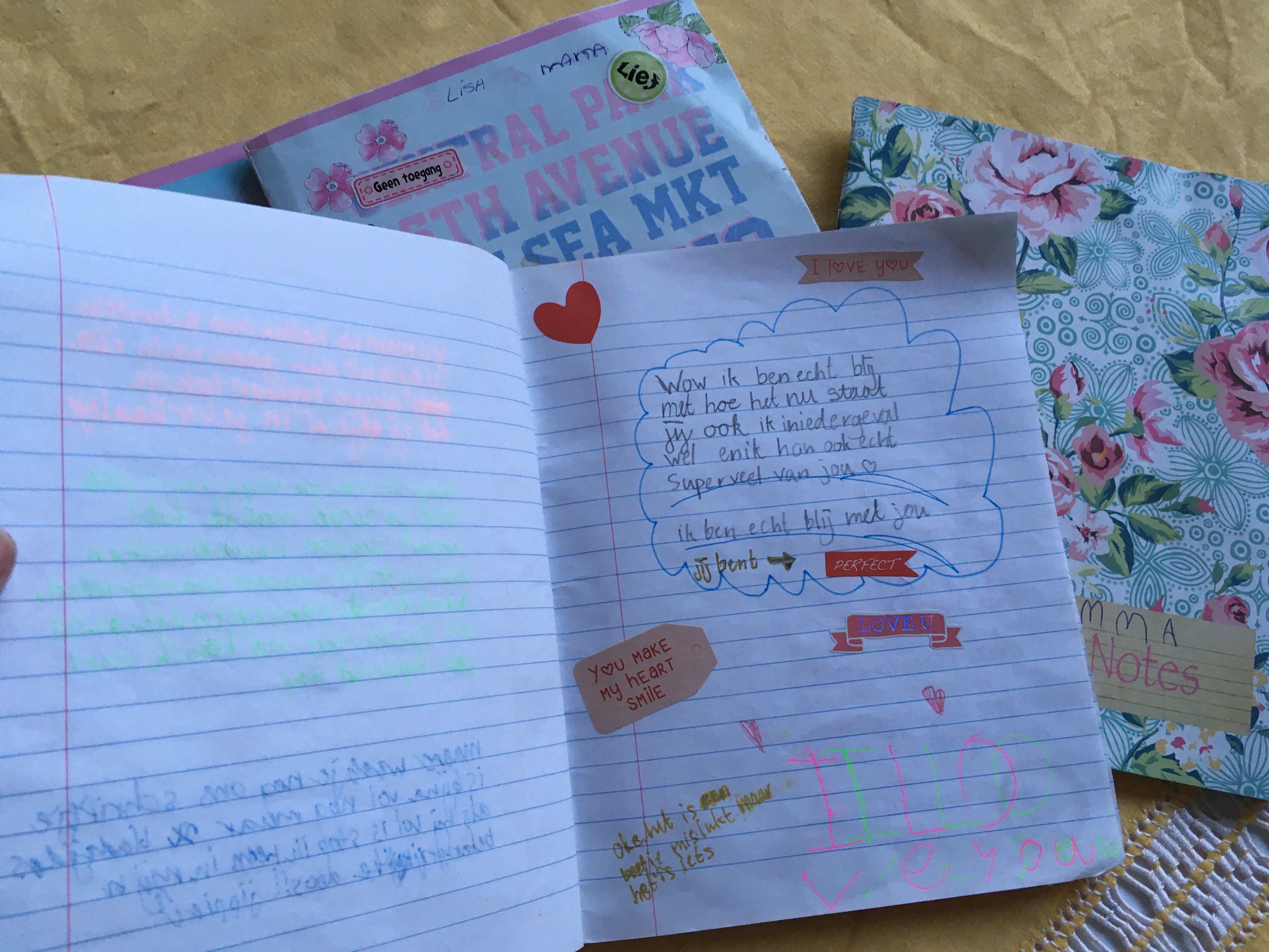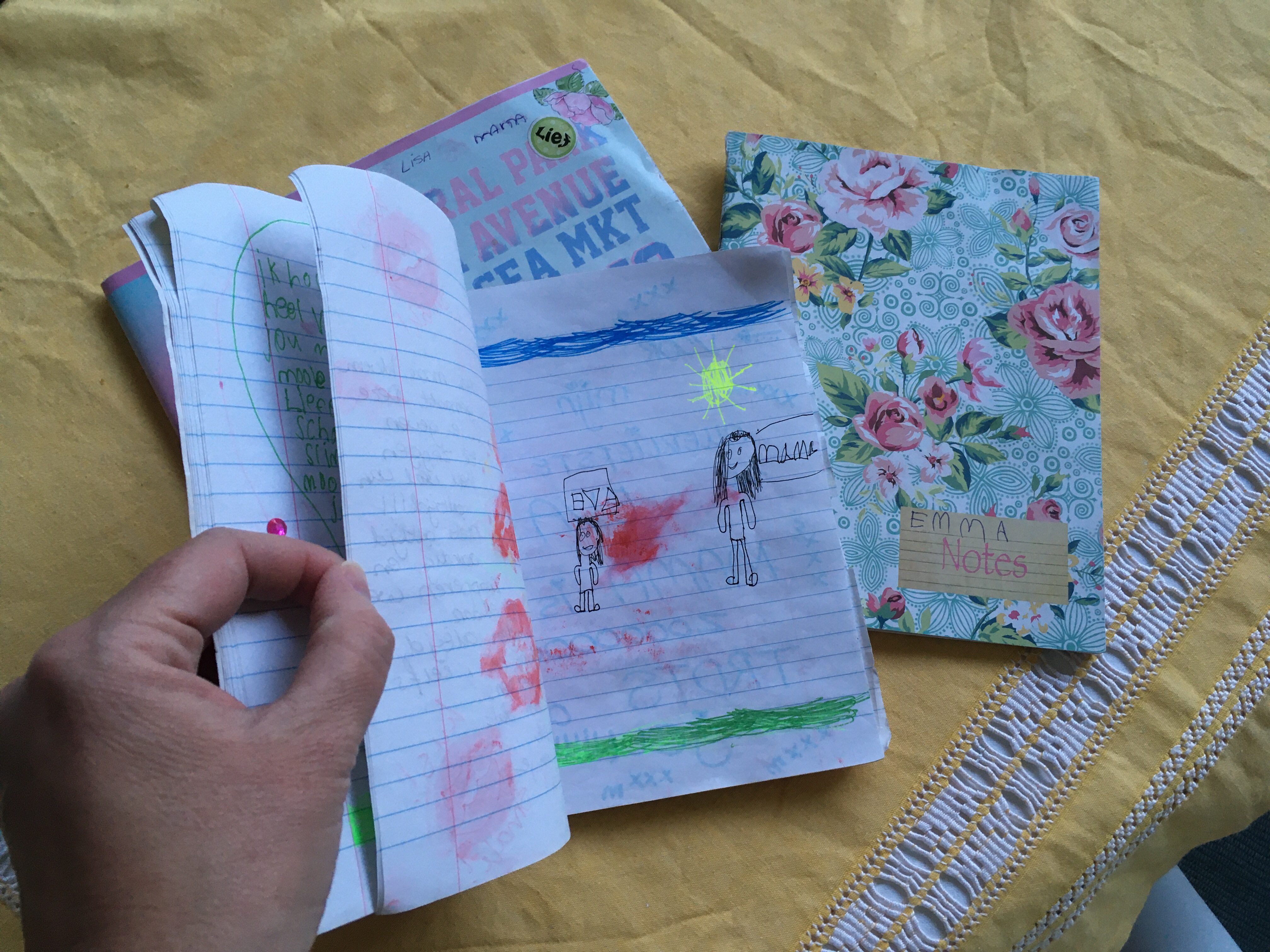 Ik ben begonnen met dagboekschrijven met mijn drie dochters tijdens een hectische en lastige periode waarin communiceren niet altijd even makkelijk was. Mijn jongste was toen 5 jaar, mijn middelste 7 en mijn oudste 9. Inmiddels zijn we een paar jaar en twee à drie schriften verder. We hebben alle vier een eigen boekje die we uitwisselen, waarin we korte berichten schrijven en kleine tekeningetjes maken. Wanneer we klaar zijn, leggen we het schriftje op een plek waar de ander gegarandeerd komt, bijvoorbeeld op het kussen van het bed of op het nachtkastje.