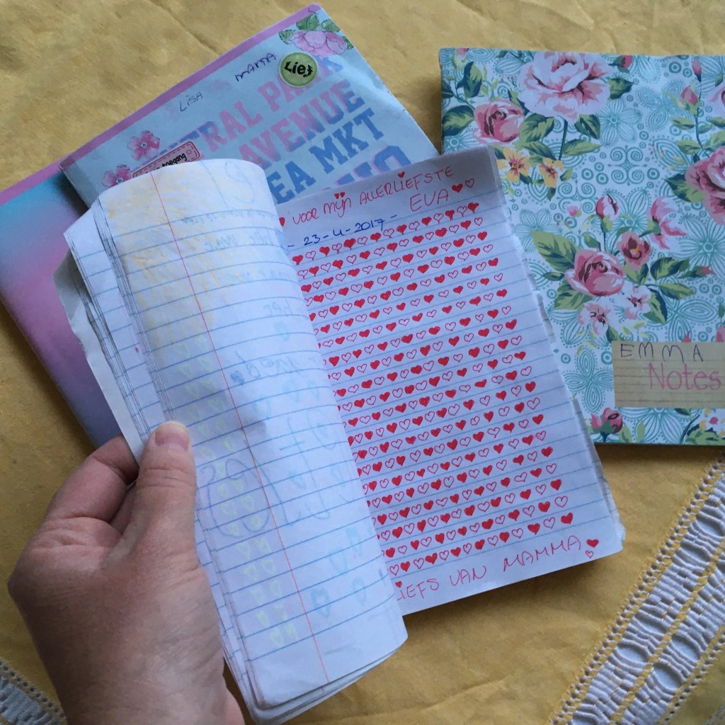 Wat ik het allermooist vind, is dat de verzameling dagboek-schriften alle uitingen van dankbaarheid, alle verontschuldigingen, alle hartjes en alle lippenstiftkusjes vereeuwigt! De volgeschreven schriftjes bewaren we in onze eigen herinneringsdoos.