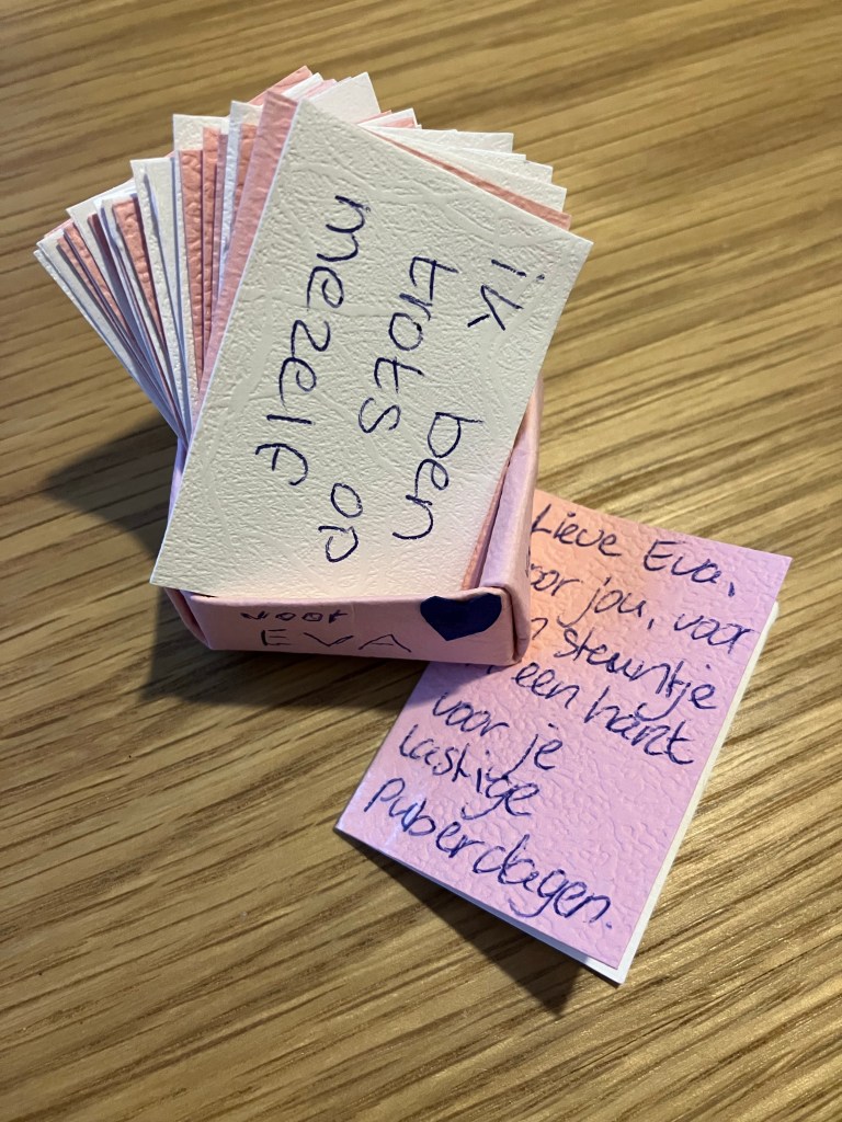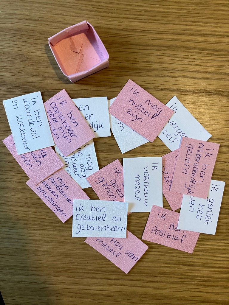 Na het gebeuren -vaker, dat mijn dochter verdrietig naar haar kamer rende, ben ik begonnen met het schrijven van affirmatie kaartjes -oftewel bevestigings- / erkenningskaartjes. Mijn continue verlangen om haar een gezond en positief zeflbeeld te geven, wilde ik voor haar graag tastbaar en zichtbaar maken.