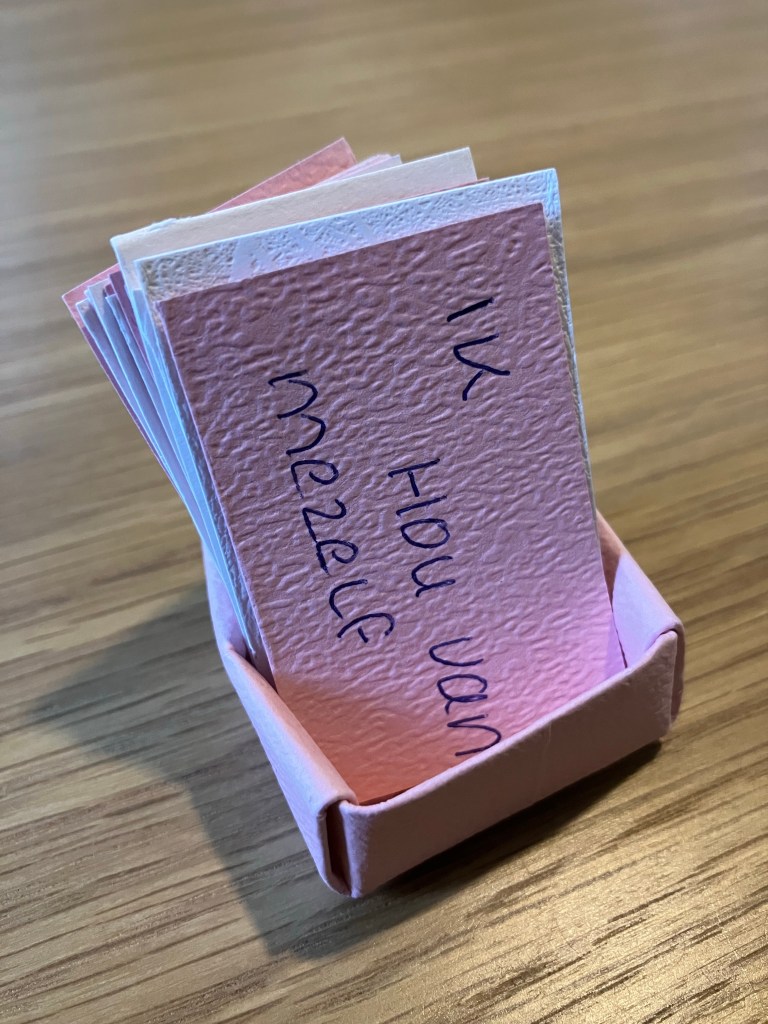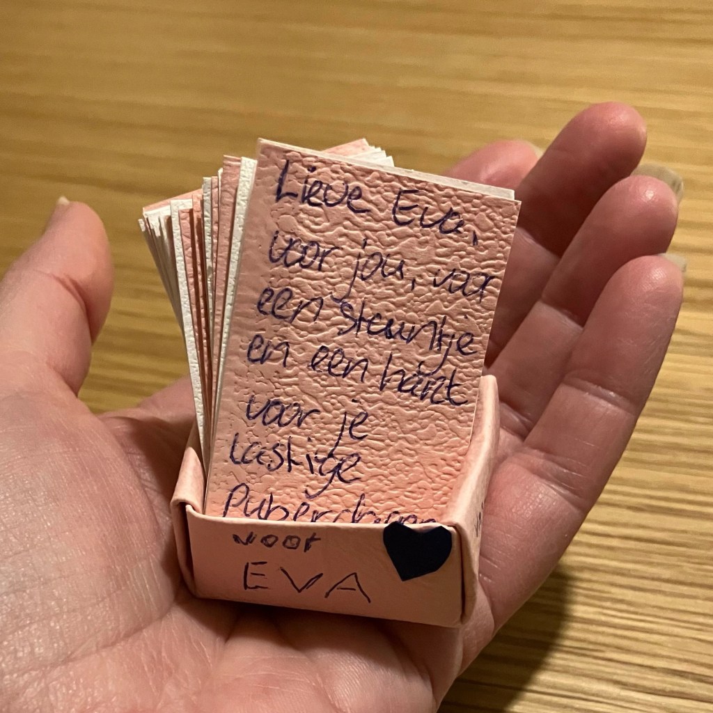 Later op deze dag, op het moment dat ze even de deur uit was, heb ik het doosje op haar bureau in haar kamer neergezet.