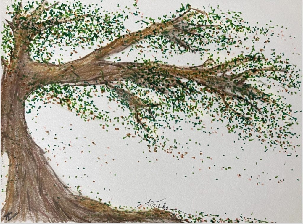 Stel je voor dat je een boom tekent, zijn takken sterk en zijn blaadjes ritselen in de wind. Hoe sterker je gevoelens, hoe krachtiger de wind waait en hoe meer de blaadjes wapperen. Deze boom weerspiegelt jouw emoties, dat wat je allemaal van binnen voelt.