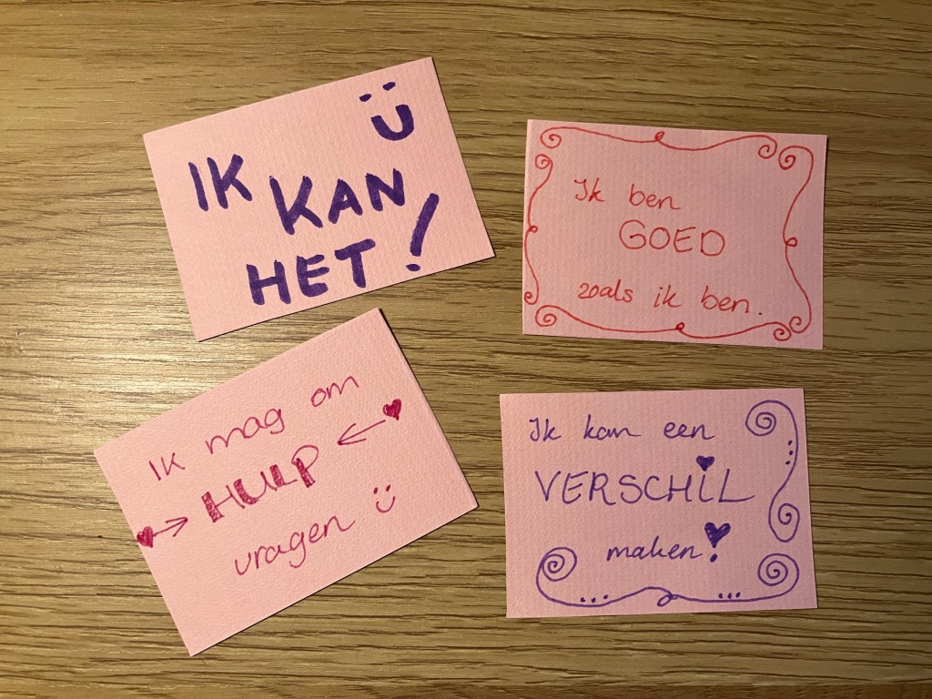 De teksten op de kaartjes zetten een kind in zijn kracht. Met woorden kun je zelfvertrouwen klein maken, maar ook groot!