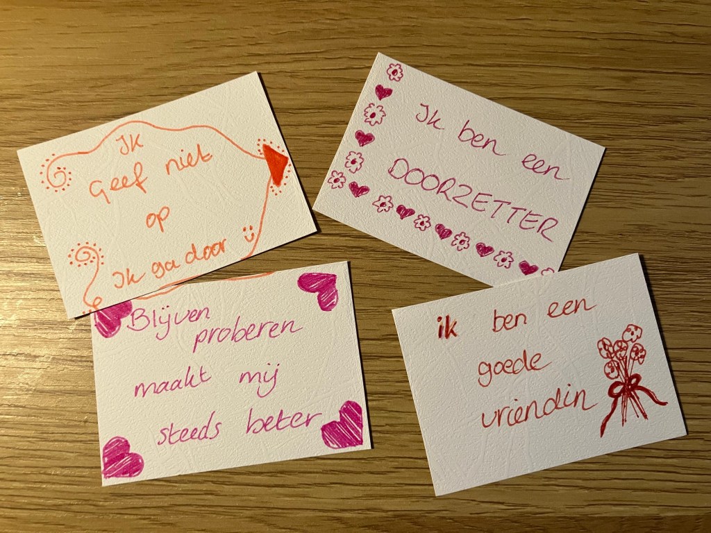 - Creatieve uitlaatklep: Laat kinderen hun eigen krachtkaartjes maken met persoonlijke affirmaties en tekeningen.