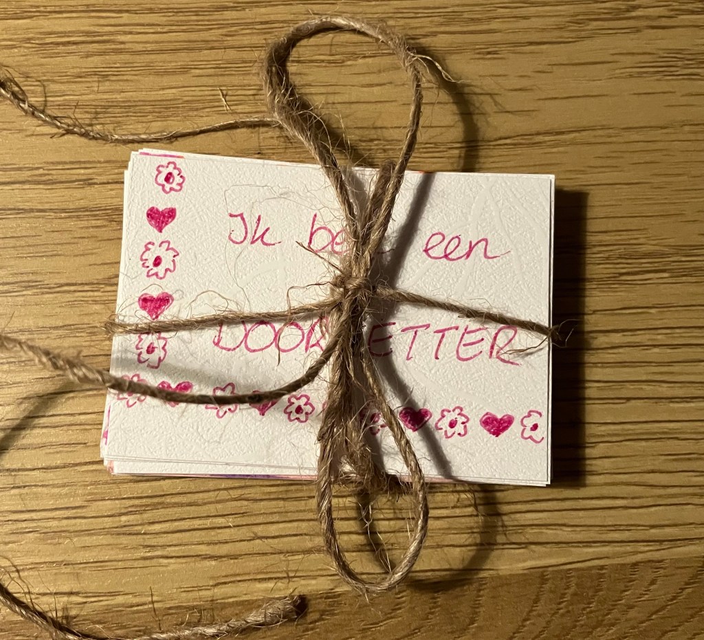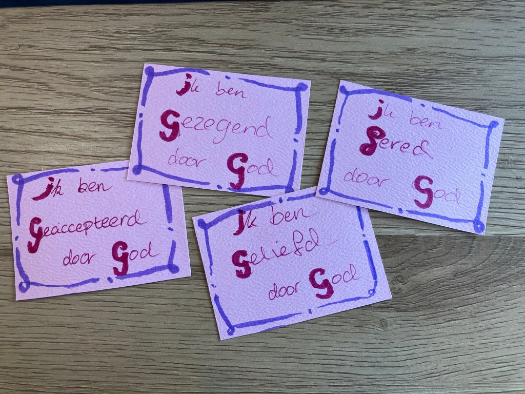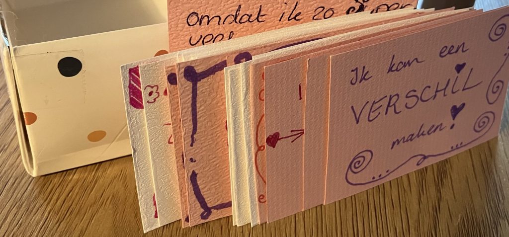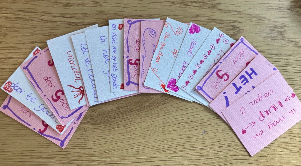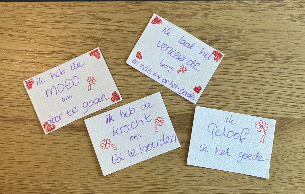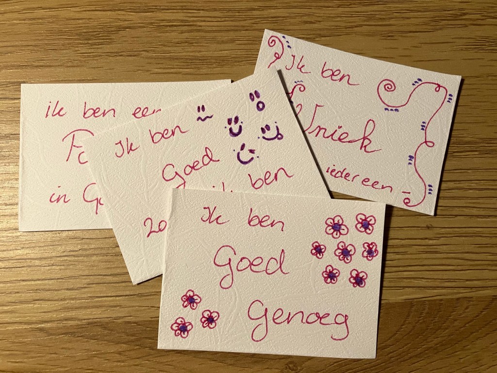 Bij het maken van de kaartjes kun je karaktereigenschappen extra benadrukken door ze op te schrijven en op te lezen. Het feit dat je kind ze in eigen bezit heeft – dus het zichtbaar en tastbaar hebben gemaakt van persoonlijke eigenschappen – maakt dat het zich gesterkt voelt op eigen kracht (zelf gemaakt/gekregen) en meer geloof in zichzelf.