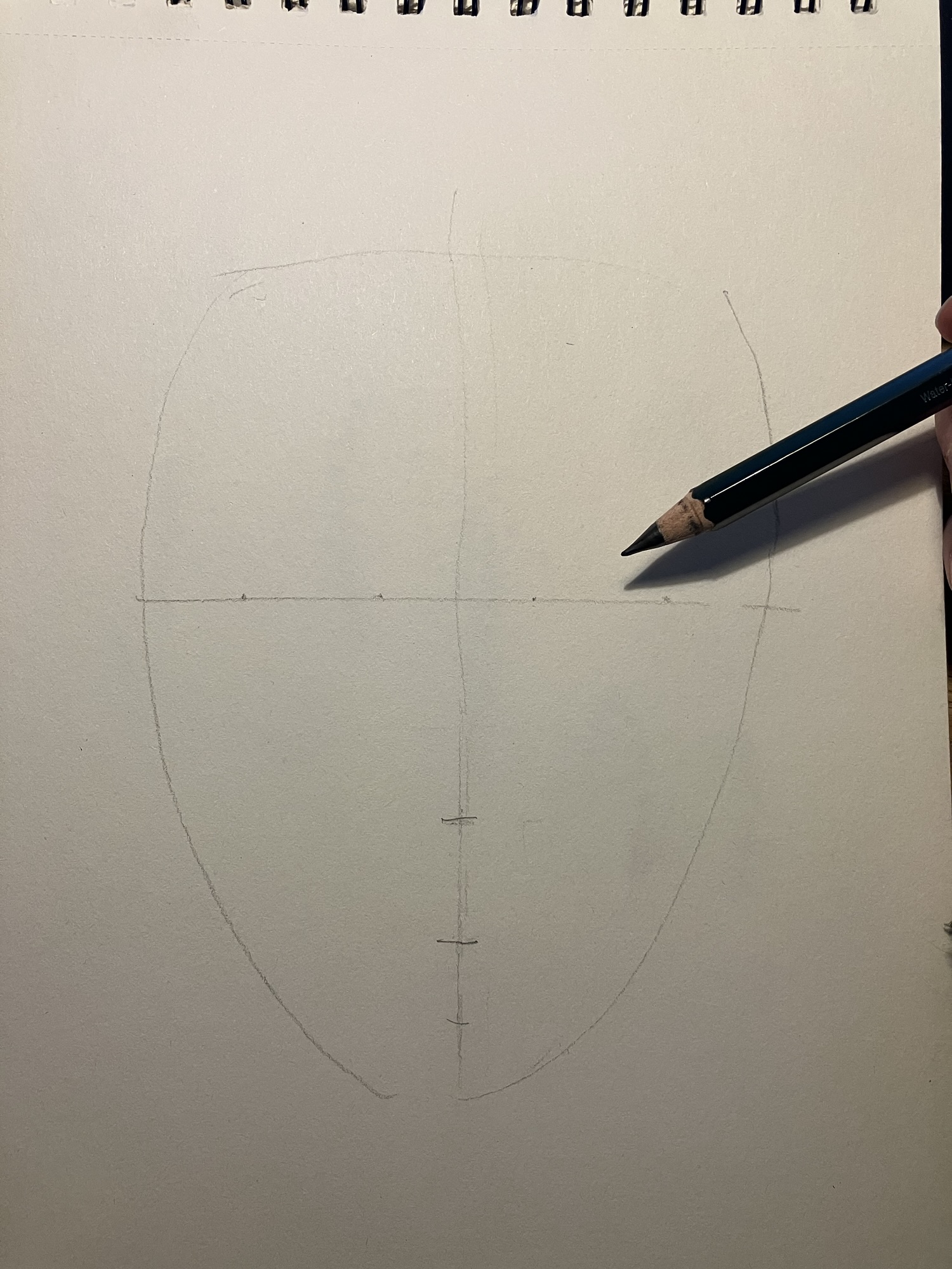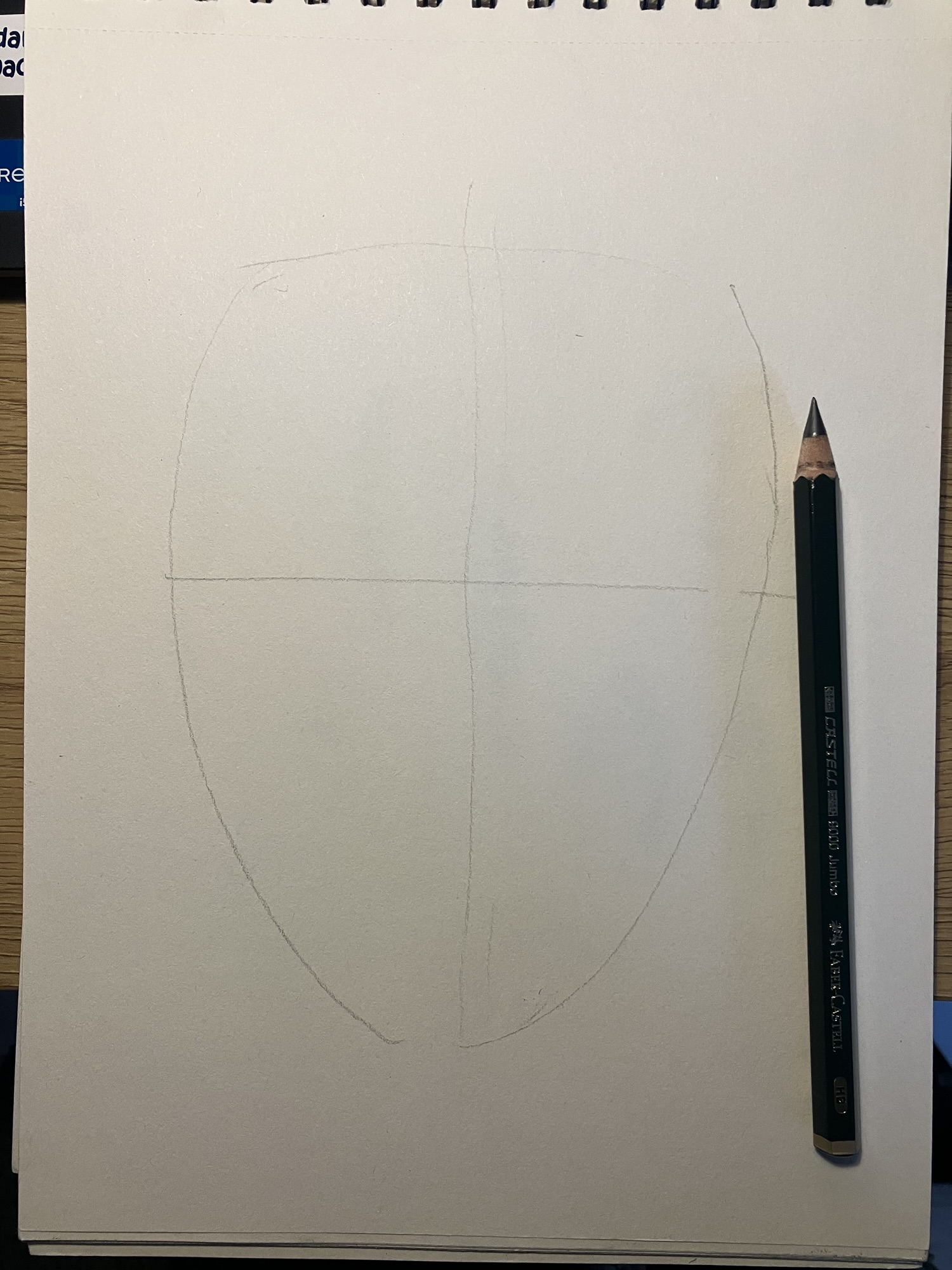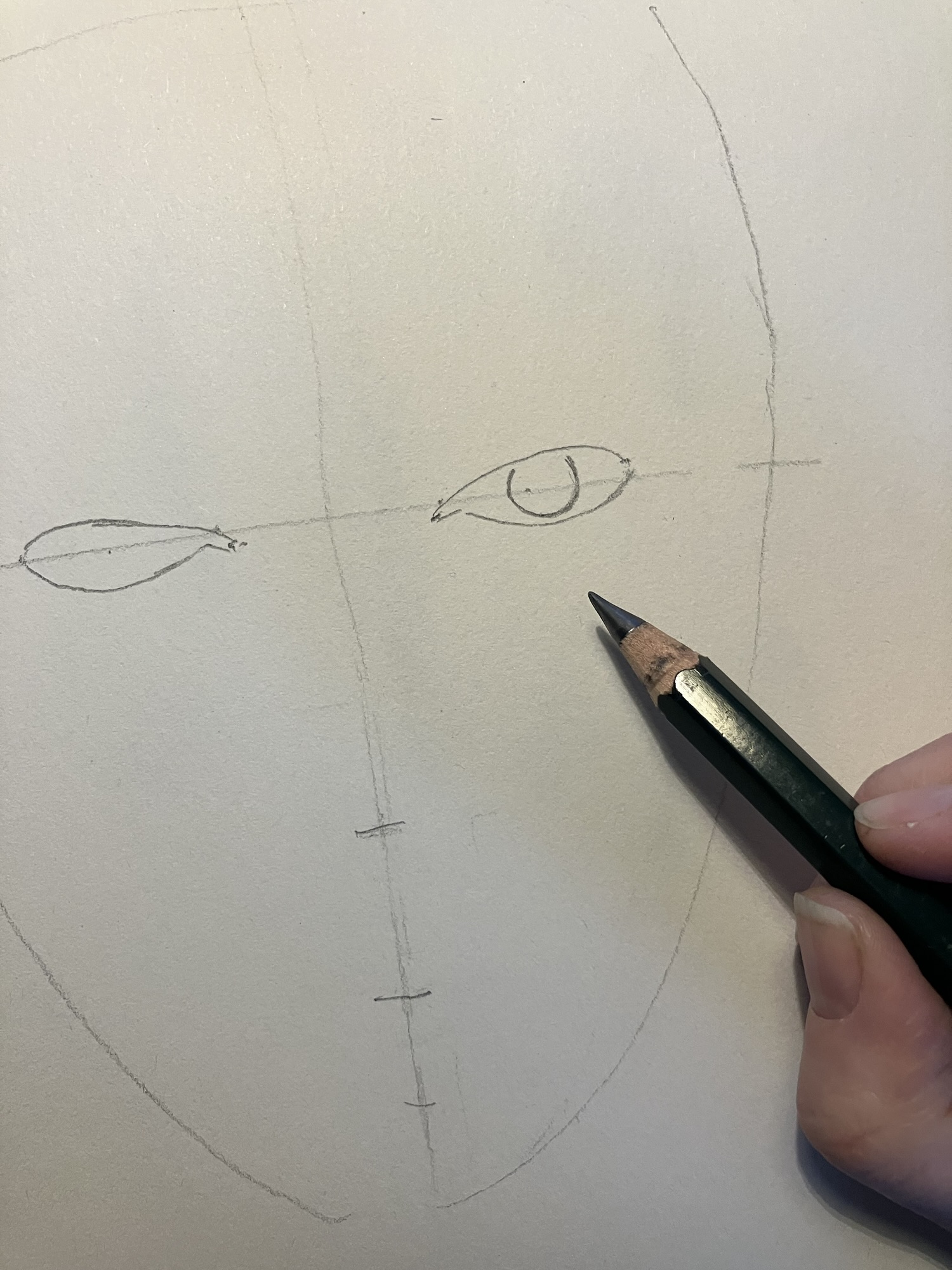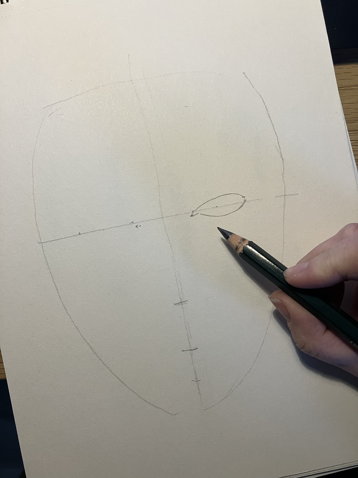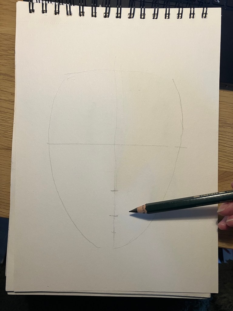 2. Hulplijnen: Teken een verticale lijn door het midden van het ovaal en een horizontale lijn halverwege om de ogen te plaatsen.