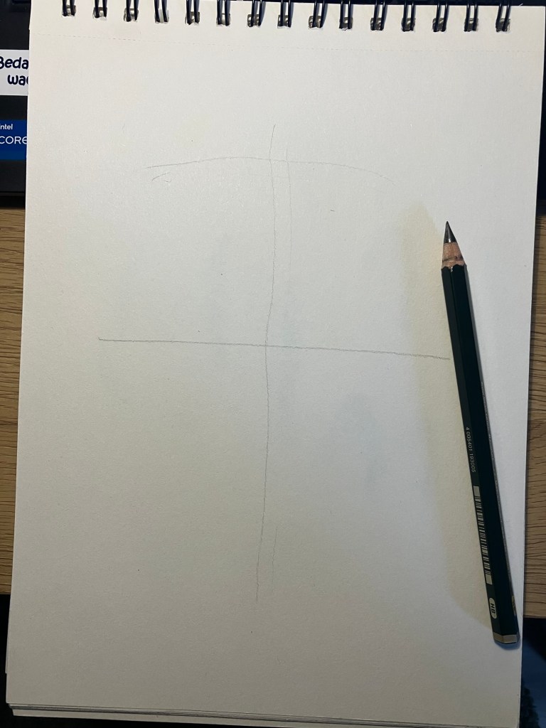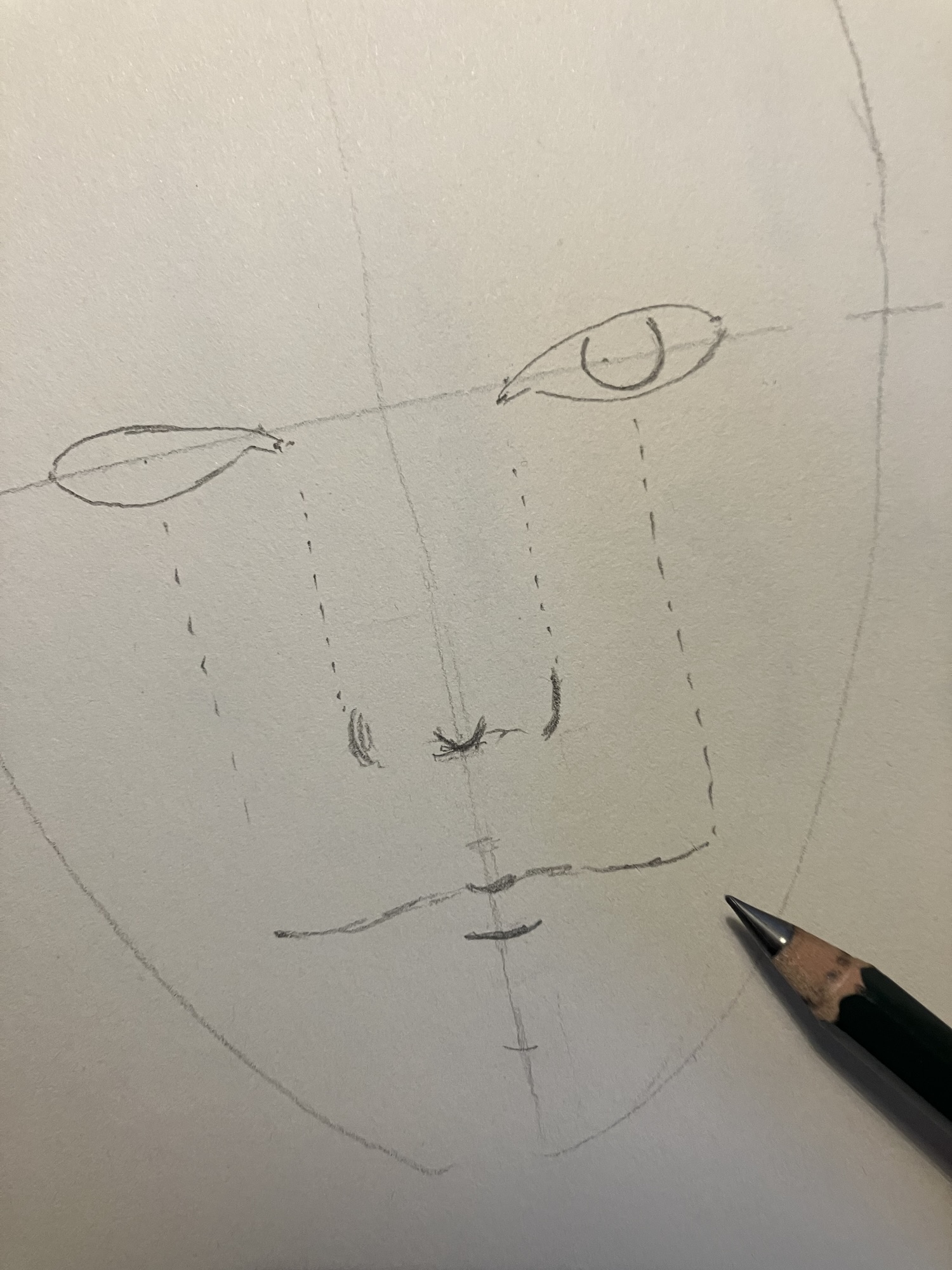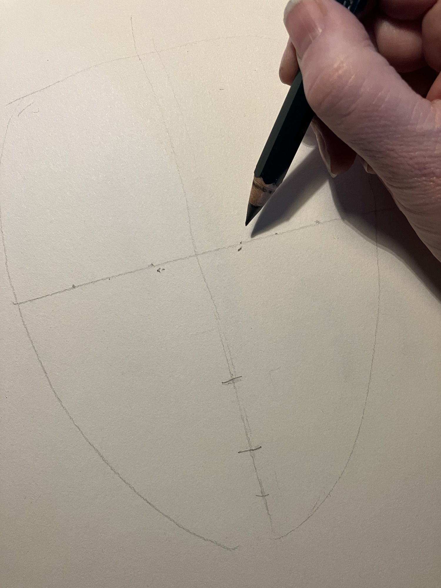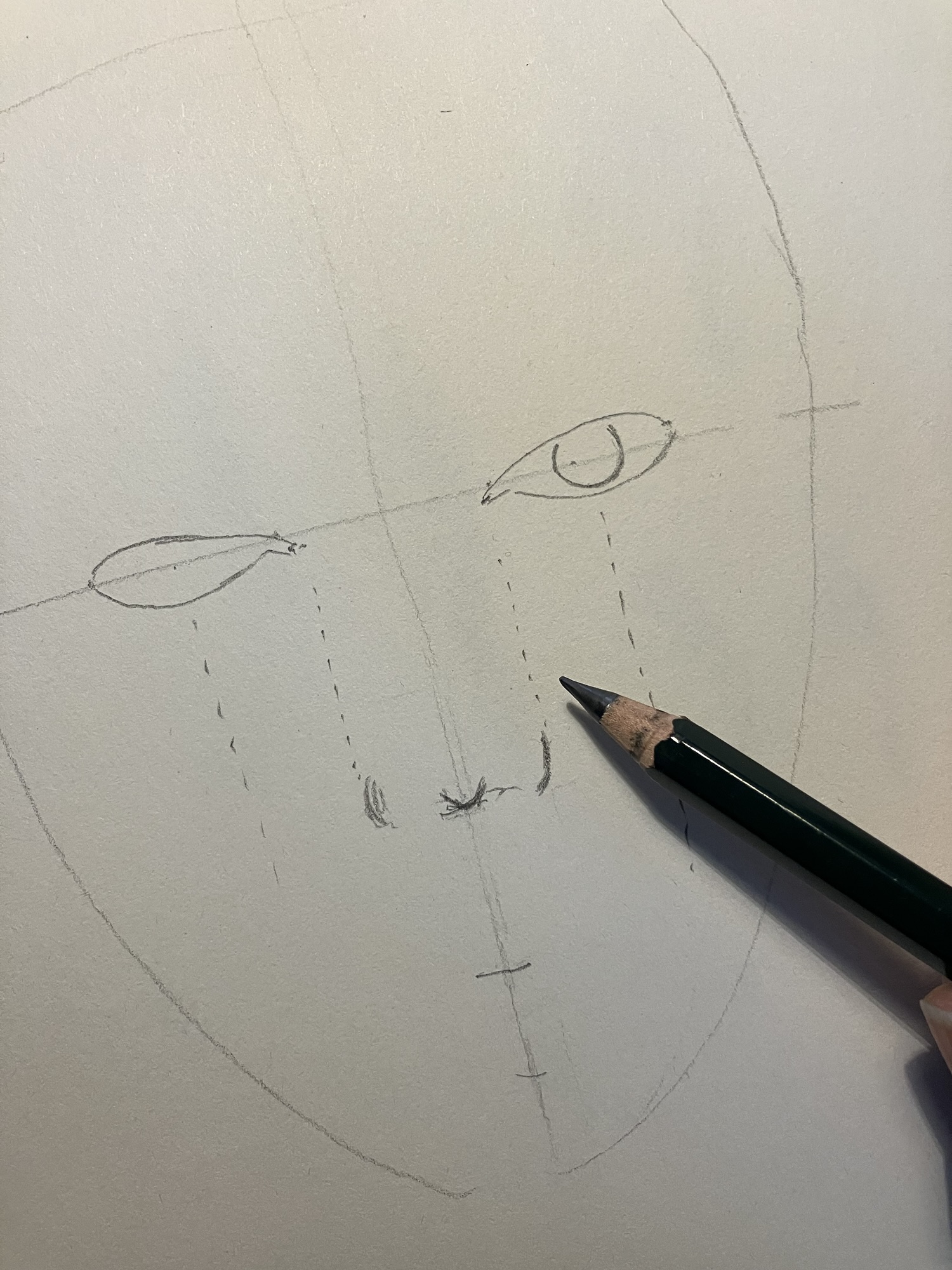 2. Hulplijnen: Teken een verticale lijn door het midden van het ovaal en een horizontale lijn halverwege om de ogen te plaatsen.