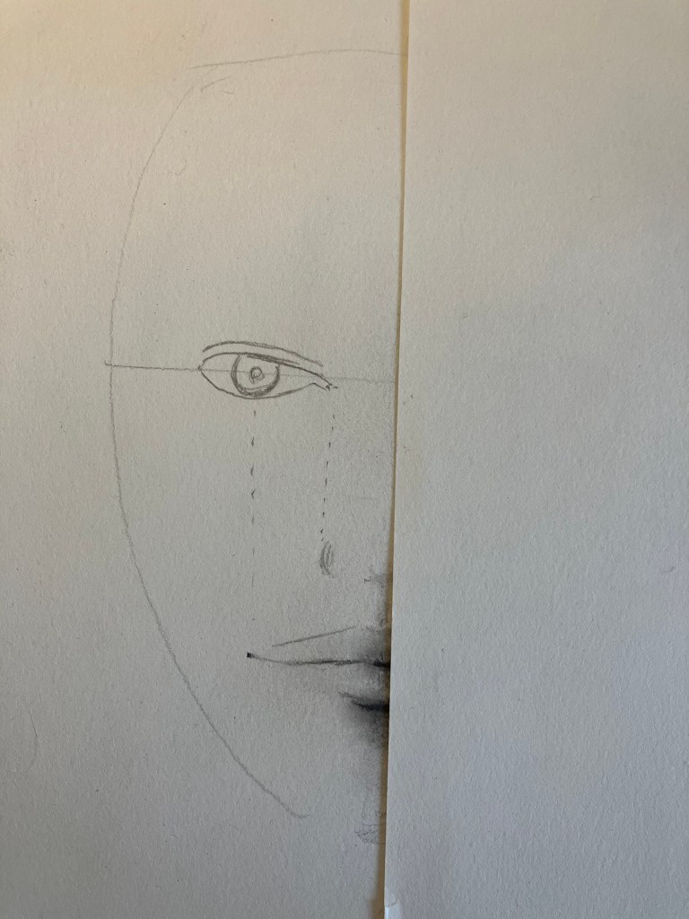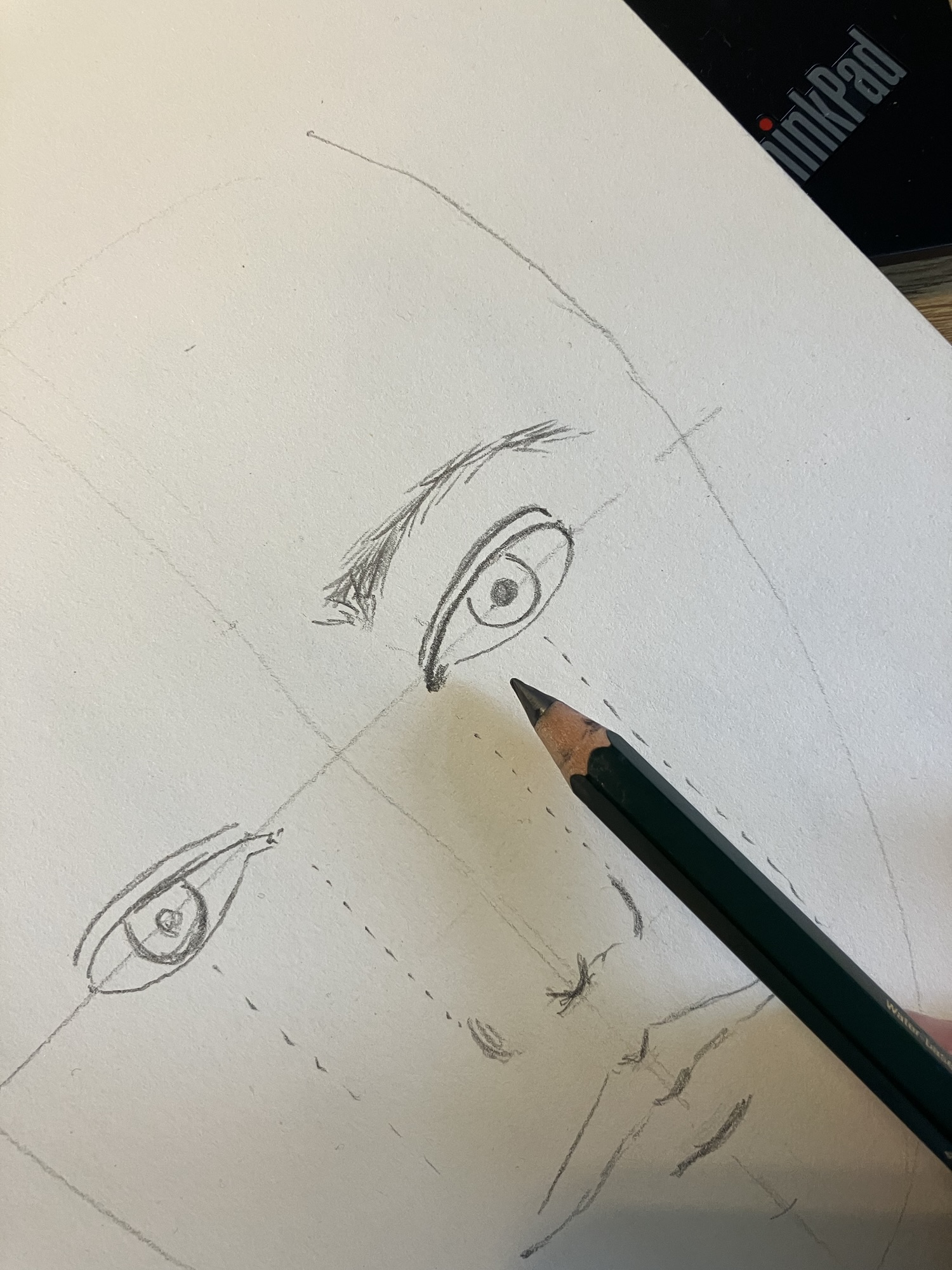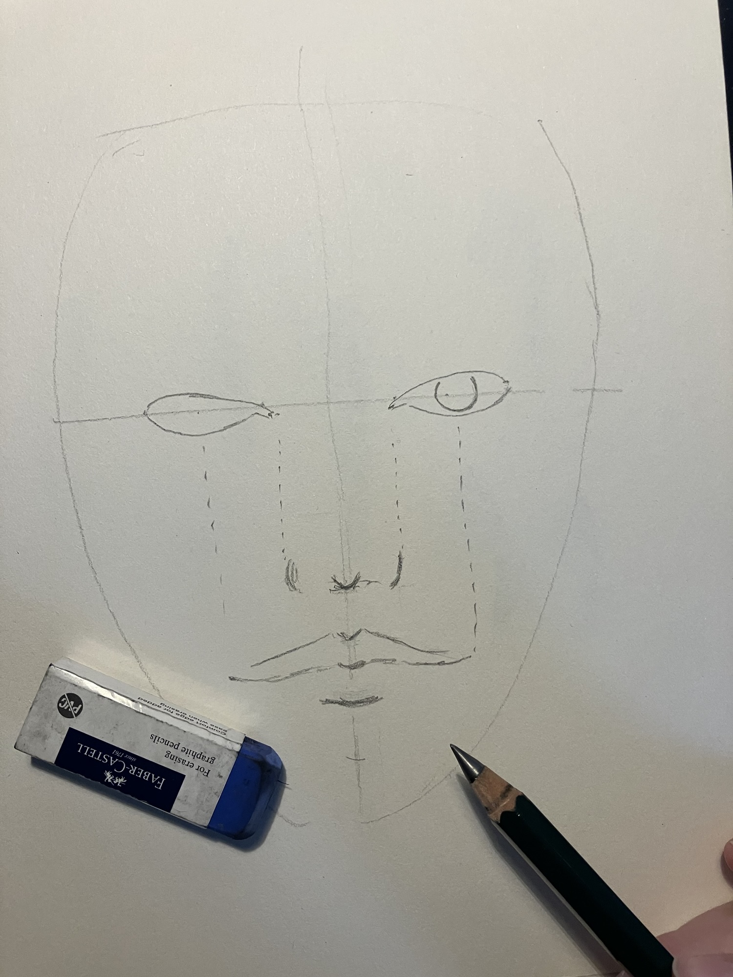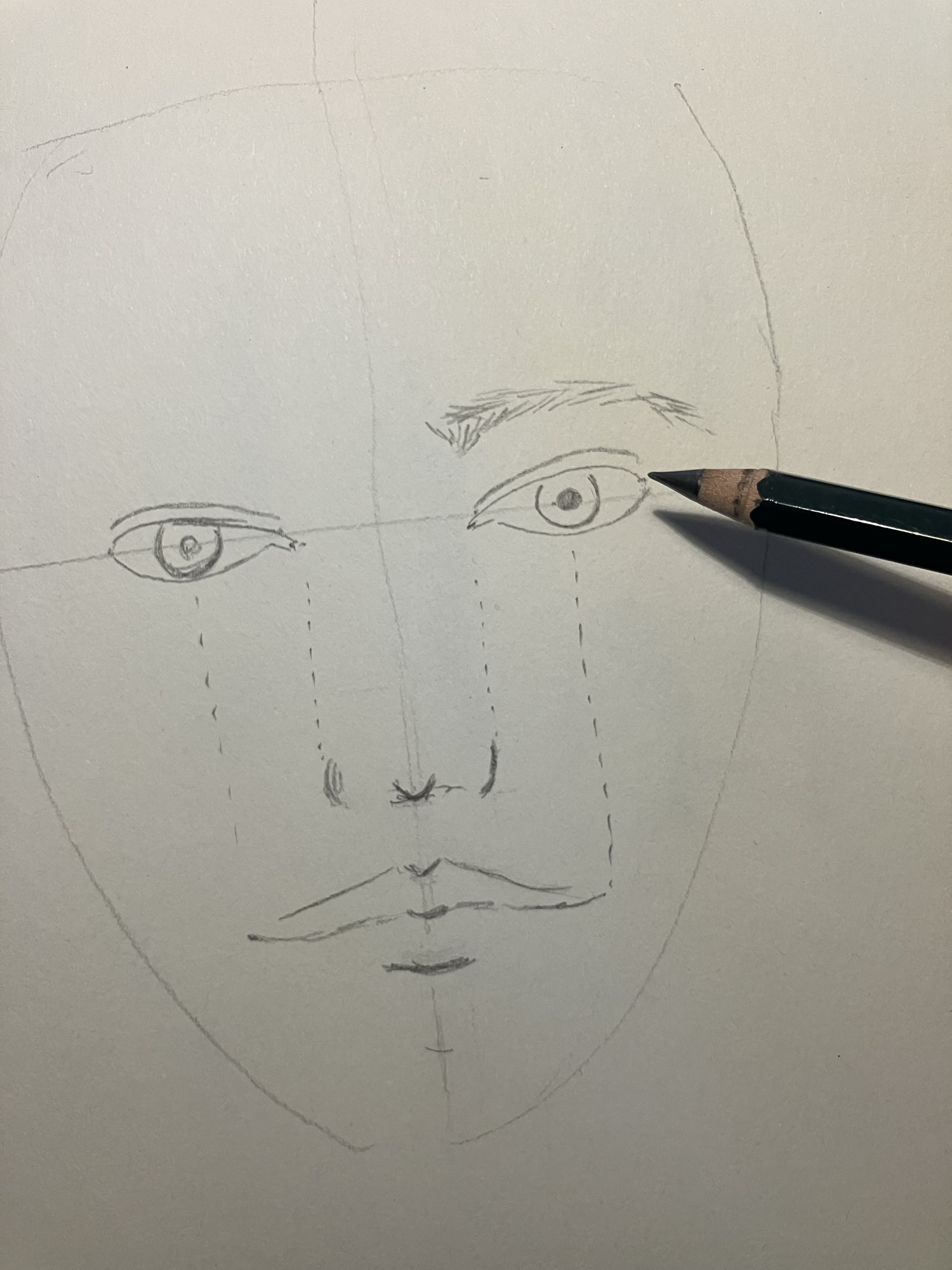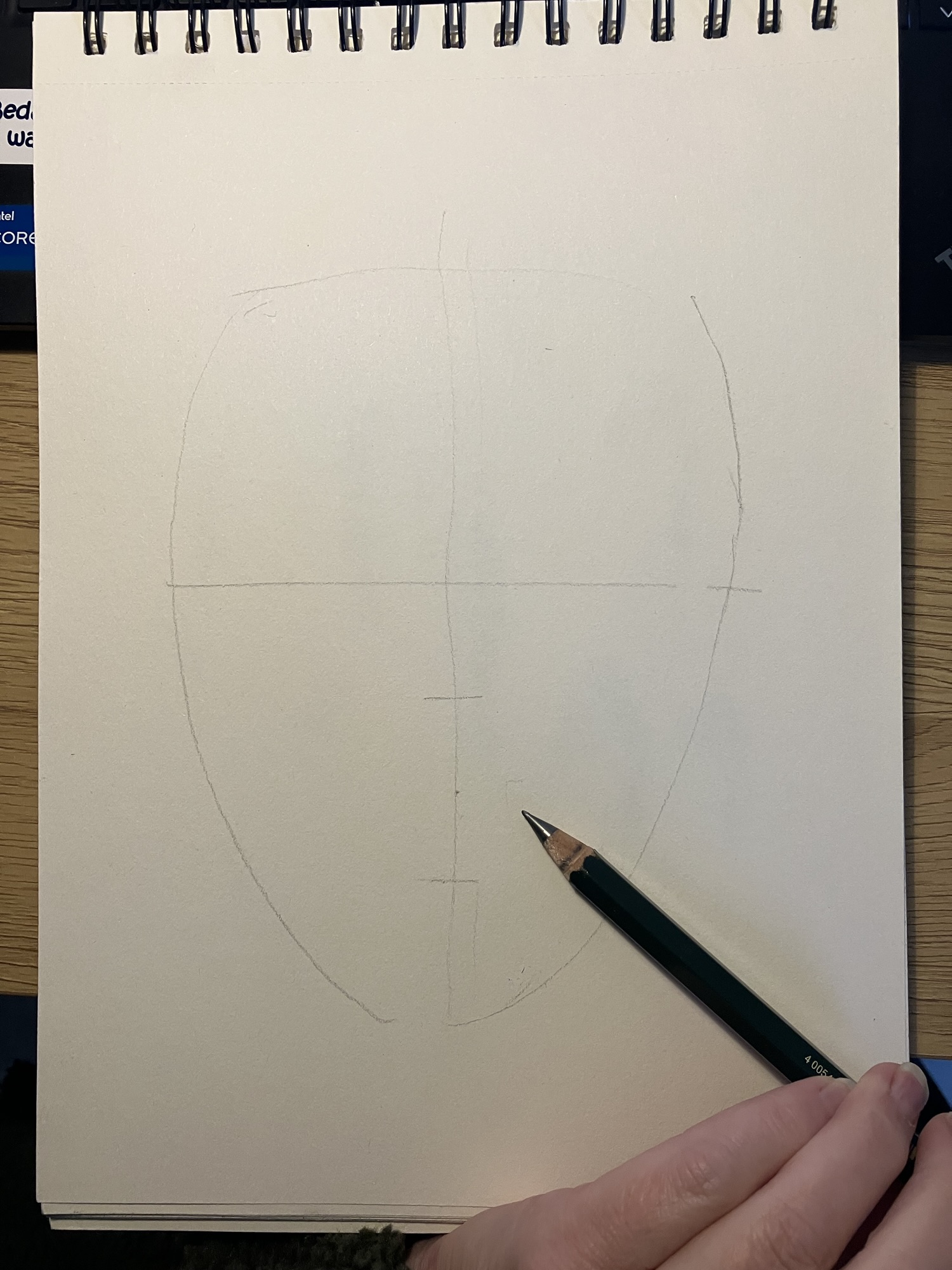 2. Hulplijnen: Teken een verticale lijn door het midden van het ovaal en een horizontale lijn halverwege om de ogen te plaatsen.