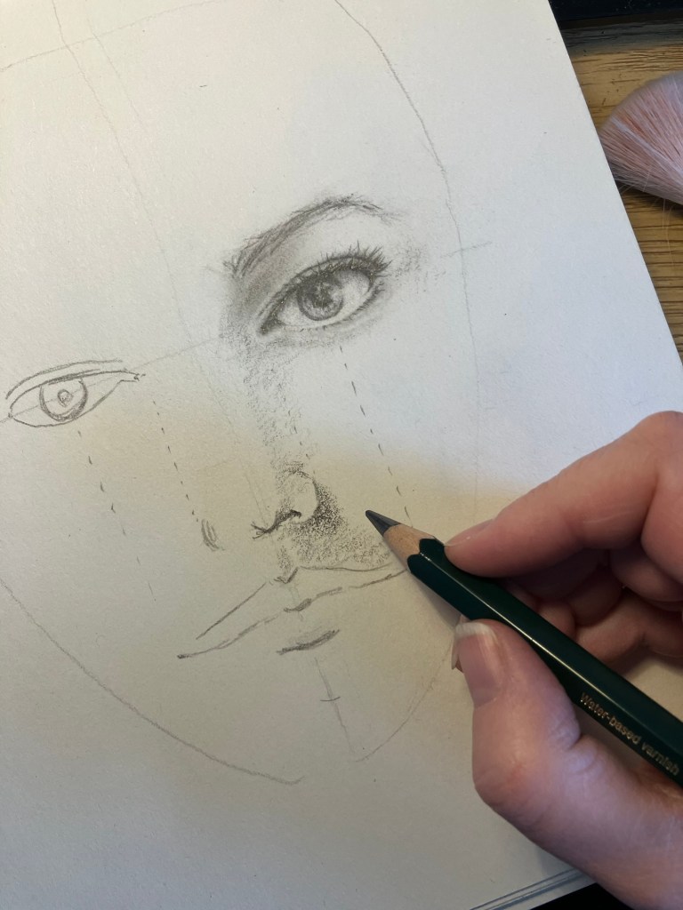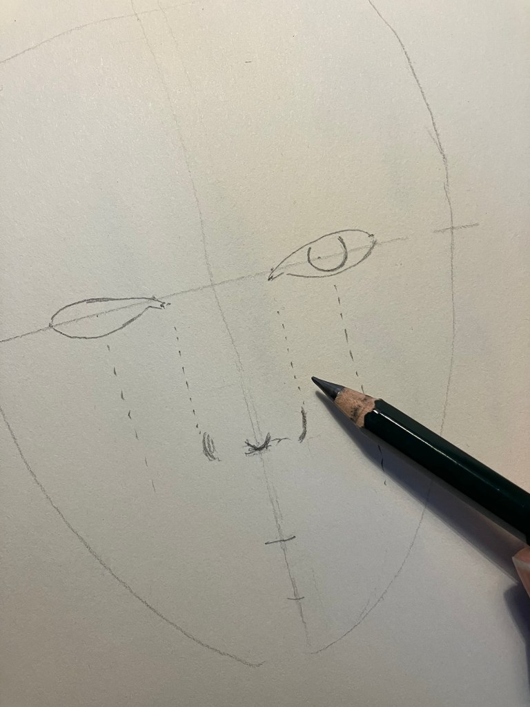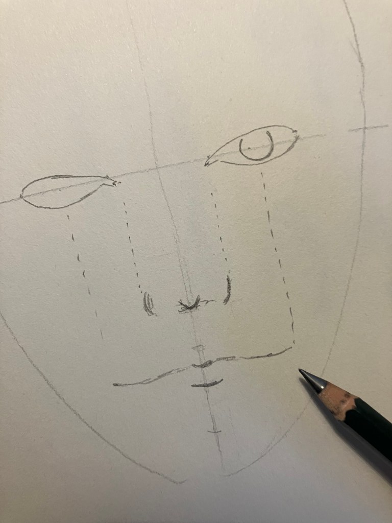 Begin met de grote vormen zoals de ogen, neus, mond en oren. Houd rekening met de verhoudingen tussen deze onderdelen.
