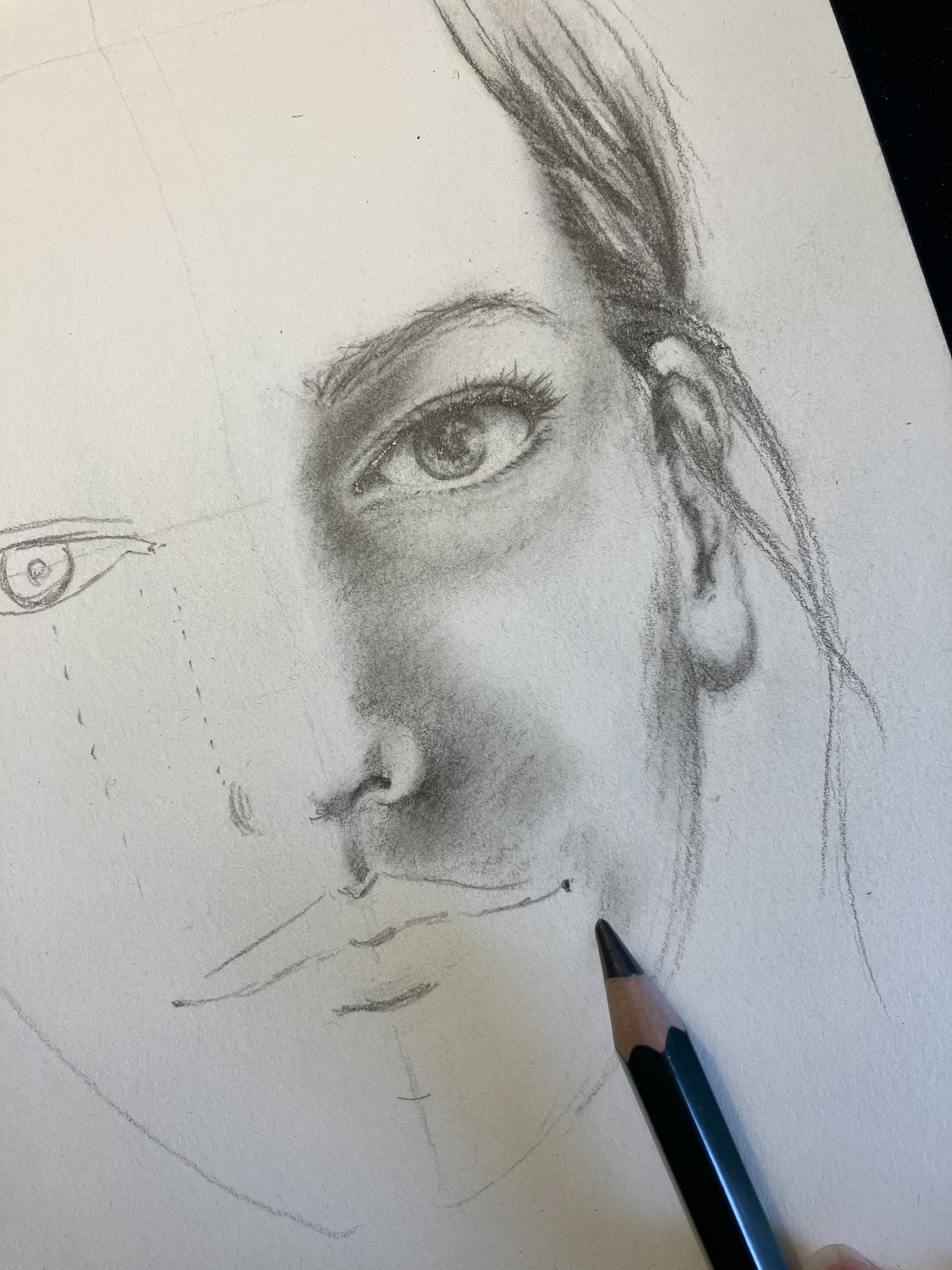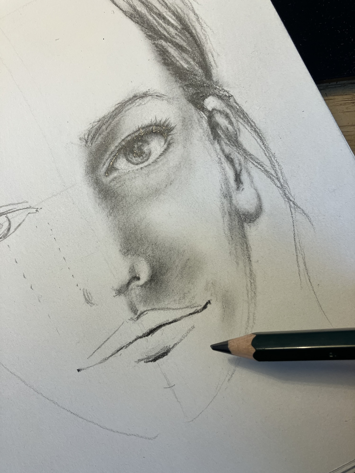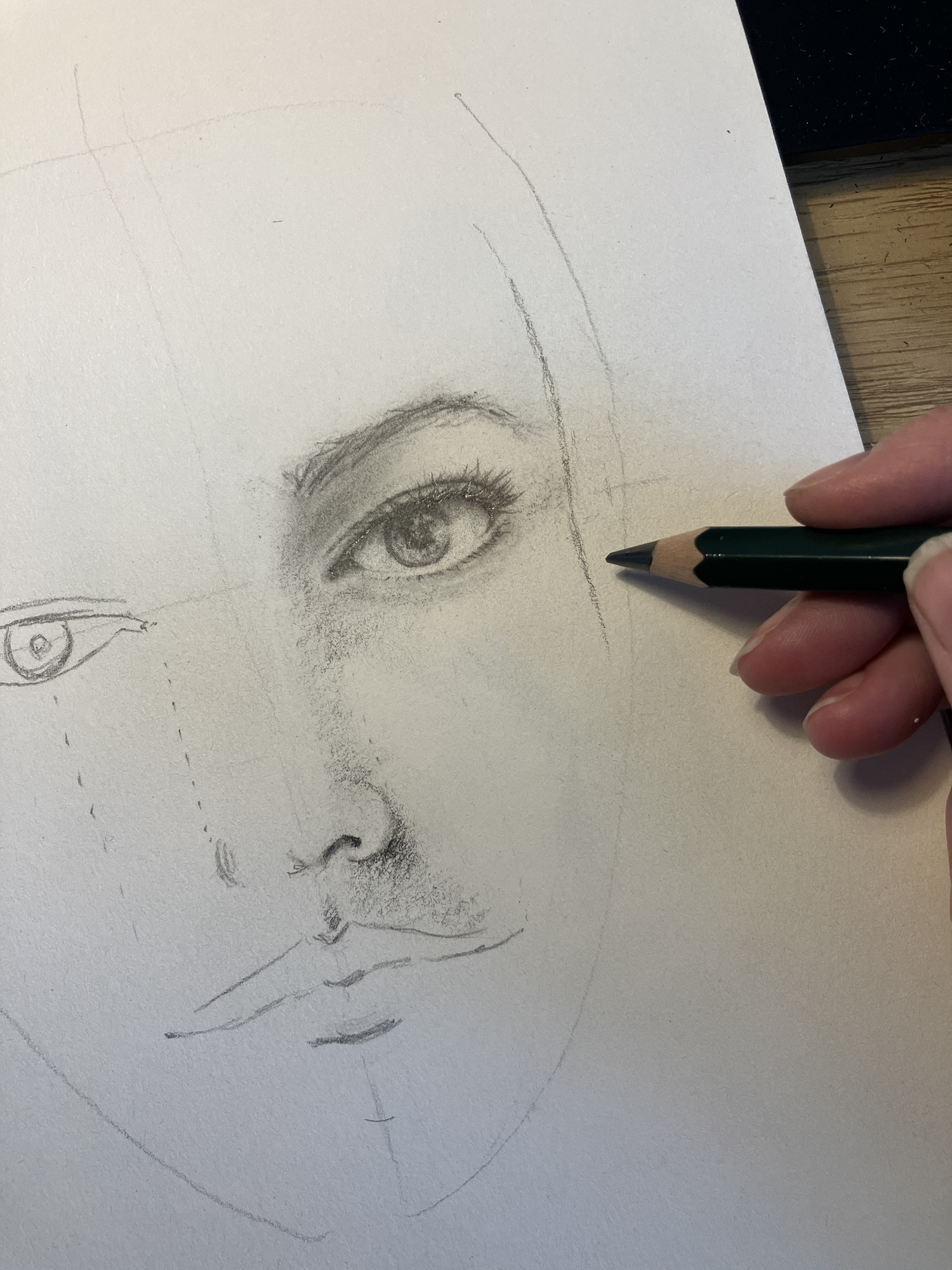 Voeg de eerste laag details toe door de contouren van de gezichtskenmerken te verfijnen. Gebruik lichte, subtiele lijnen om schaduwen en accenten aan te brengen. Dit geeft je portret diepte en maakt het realistischer. Let op de lichtval en hoe deze de vormen van het gezicht beïnvloedt. Door schaduwen op de juiste plaatsen toe te voegen, kun je het karakter en de expressie van je onderwerp echt tot leven brengen.