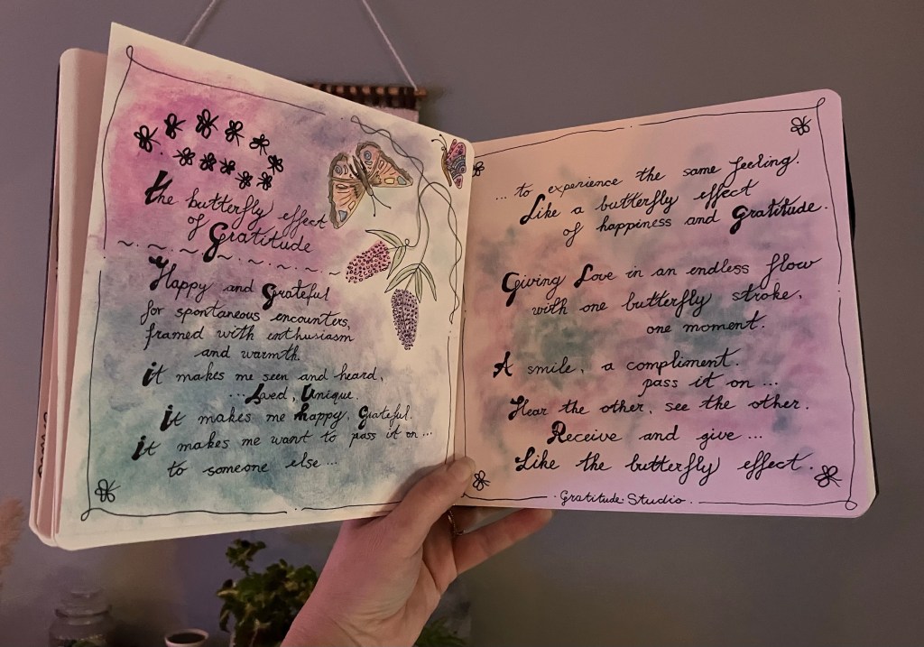 “Met een hart vol vreugde en dankbaarheid voor spontane ontmoetingen, omringd als een gouden randje door enthousiasme en warmte. Deze momenten laten me gezien en gehoord voelen, geliefd en uniek. Ze brengen me vreugde en vervullen me met dankbaarheid. Het inspireert me om deze gevoelens door te geven aan anderen, zodat ook zij dezelfde vreugde kunnen ervaren. Als een vlindereffect van blijdschap en dankbaarheid, verspreidt de liefde zich in een oneindige stroom met elke vleugelslag, elk moment. Een glimlach, een compliment. Geef het door… hoor de ander, zie de ander. Ontvang en geef… als het vlindereffect.”